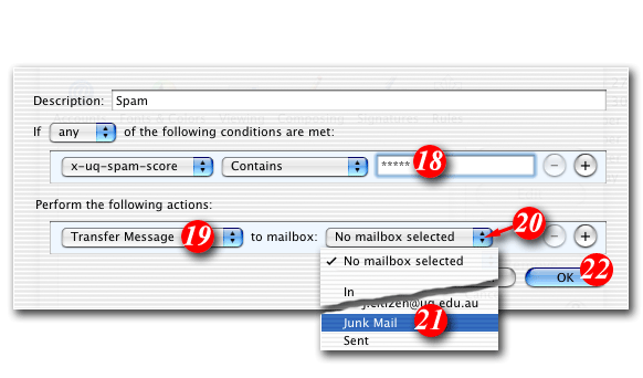 Your mail filter should now be in place. You should find that any filtered junk mail has been filtered out into the "Junk Mail" folder. The spam filter by default defines anything with a "spam score" of 4 or more as probably spam. You can personalise the filtering rules to be more or less restrictive by increasing or decreasing the number of asterisks after 'X-SpamDetect:'.For example, if you wanted to consider anything with a score of 3 or more to be spam, the rule would look like: 'X-SpamDetect: ***'. Decreasing the number of asterisks will result in Mac Mail classifying more e-mails as spam. You may need to check your spam folder more carefully for non-spam e-mails that might have been classified as spam. If you wanted to rate anything with a score of 8 or greater as spam, the rule would look like: 'X-SpamDetect: ********'. Increasing the number of asterisks may result in fewer filtered e-mails being classified as spam and more potential spam staying in your Inbox.